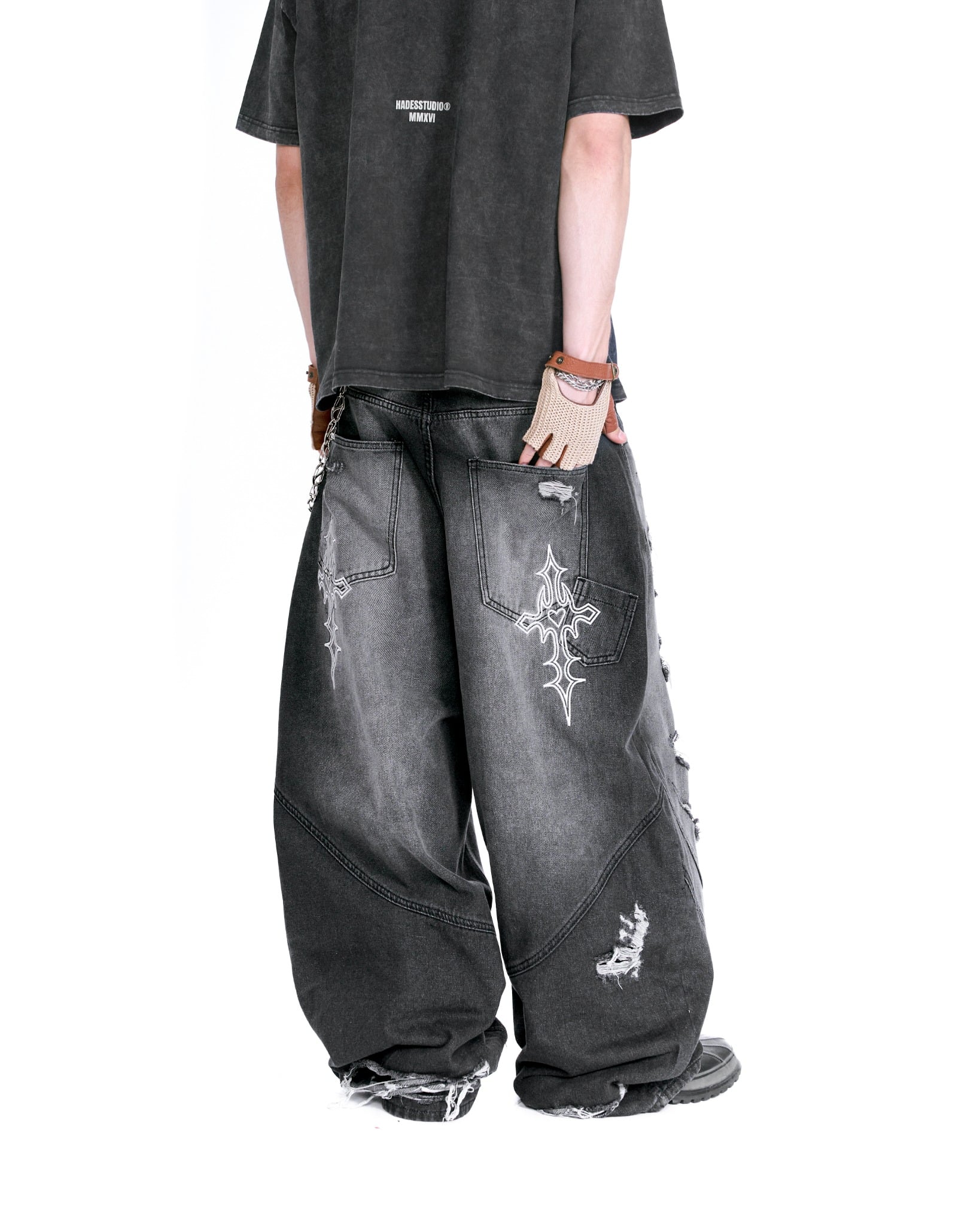 - Quần jeans wash ống rộng, dáng suông, phủ giày
